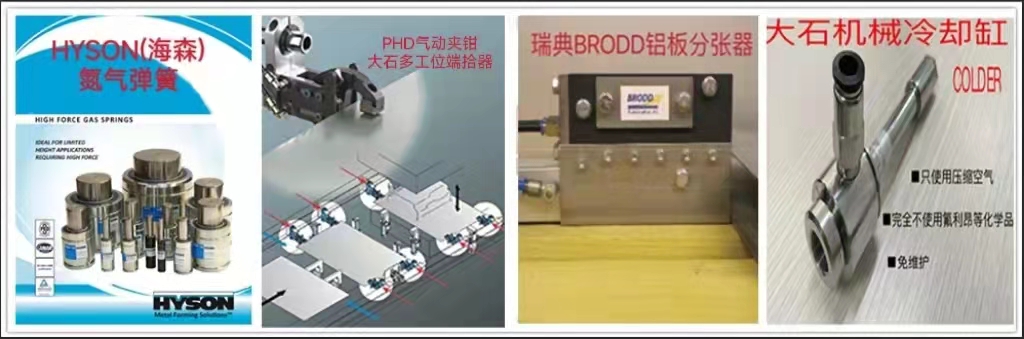 本公司是HYSON氮氣彈簧在中國的總代理,并提供管路設計及售后服務。同時還代理美國PHD氣動夾鉗、SWEDEN機器人平衡缸、美國LSP噴涂系統(tǒng)、法國PRONIC模內(nèi)攻絲機等。另外,本公司還提供多工位模具自動化端拾器產(chǎn)品,從設計、制造、運輸、安裝、調(diào)試為客戶提供整套“交鑰匙”工程。